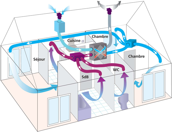 • La VMC double flux limite quant à elle les pertes de chaleur, et par conséquent d'énergie. Les calories de l'air vicié extrait du logement sont alors utilisées pour réchauffer l'air neuf insufflé. On distingue des VMC double flux à moyen rendement et à haut rendement