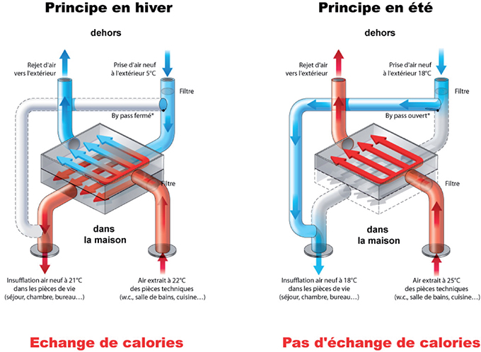 • Enfin, la VMC double flux thermodynamique comprend une pompe à chaleur permettant chauffer l'air neuf.